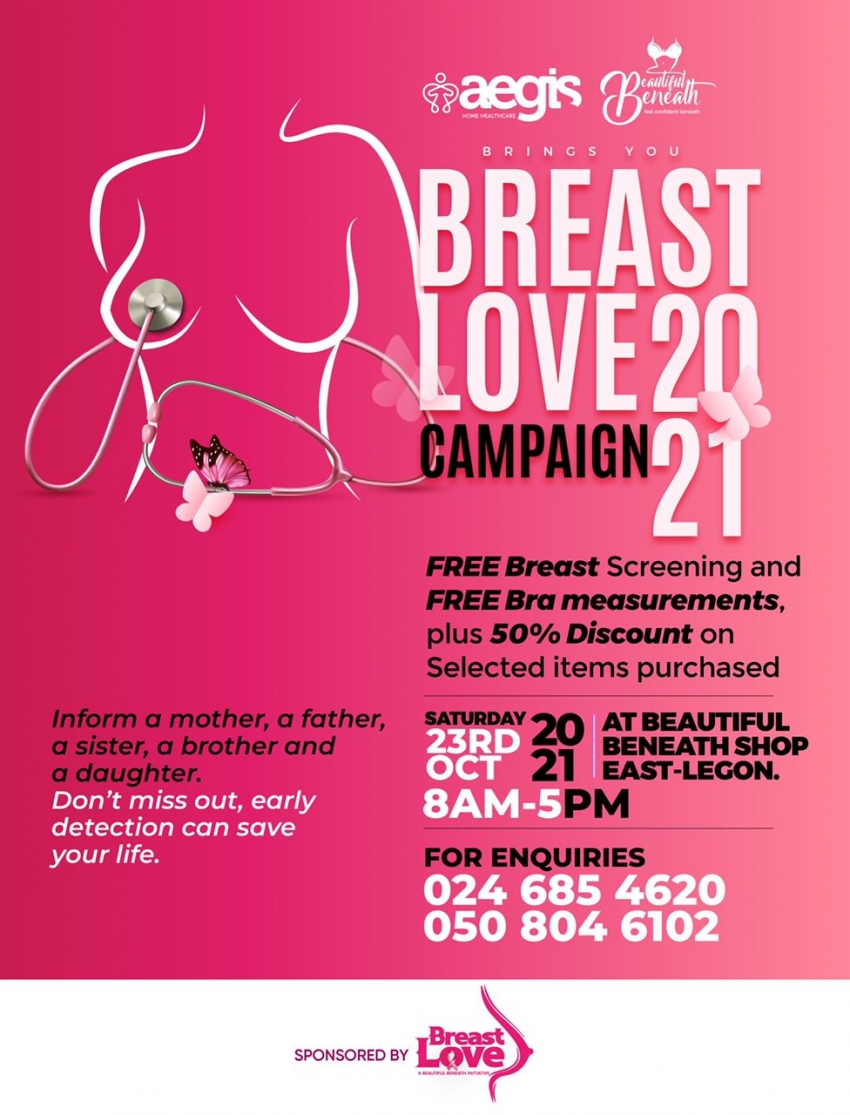 Beautiful Beneath in collaboration with Aegis Health Care are organizing “Breast Love 2021” campaign at their East Legon Shop on Saturday 23rd October 20, 2021 from 8an to 5pm.