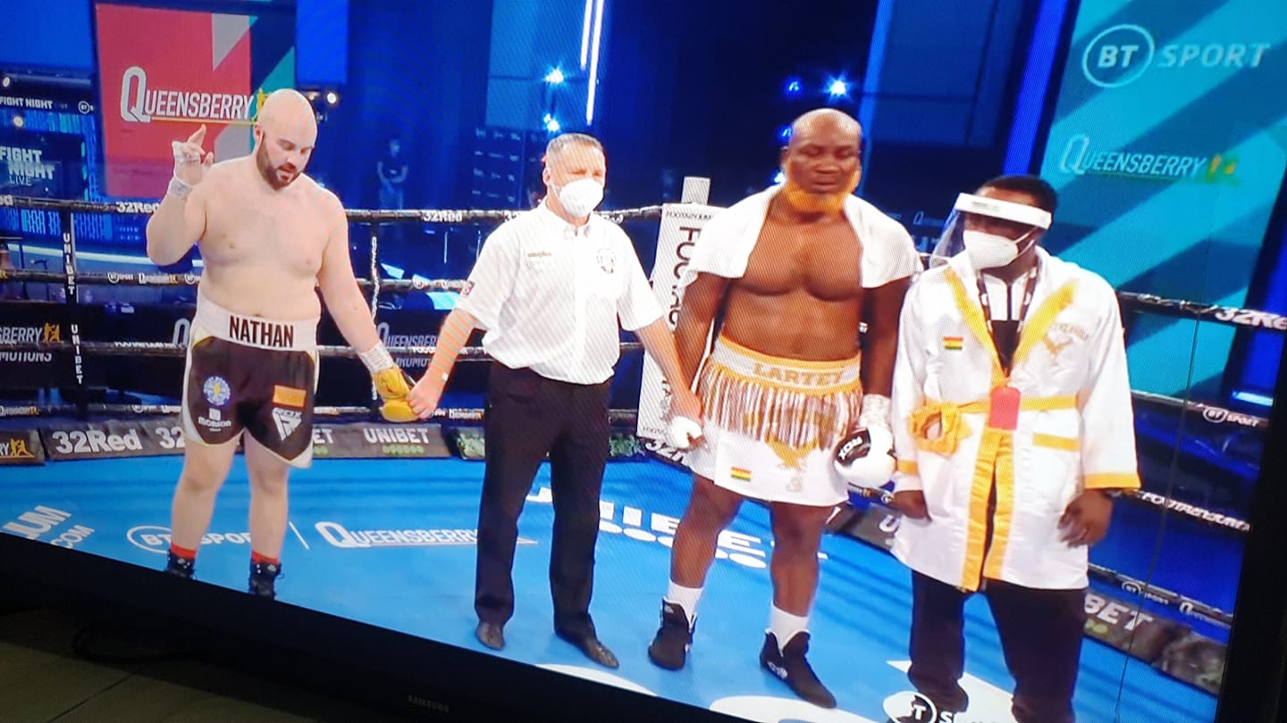 Ghanaian heavyweight boxer Richard Harrison Lartey who bragged to stop Britain’s Nathan Gorman was beaten on points last Saturday night at the BT Sports Studio in Stratford, England.