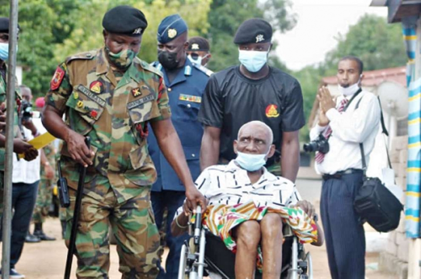 Prince Amartey (in wheelchair) being accompanied to the inauguration ceremony by an army officer