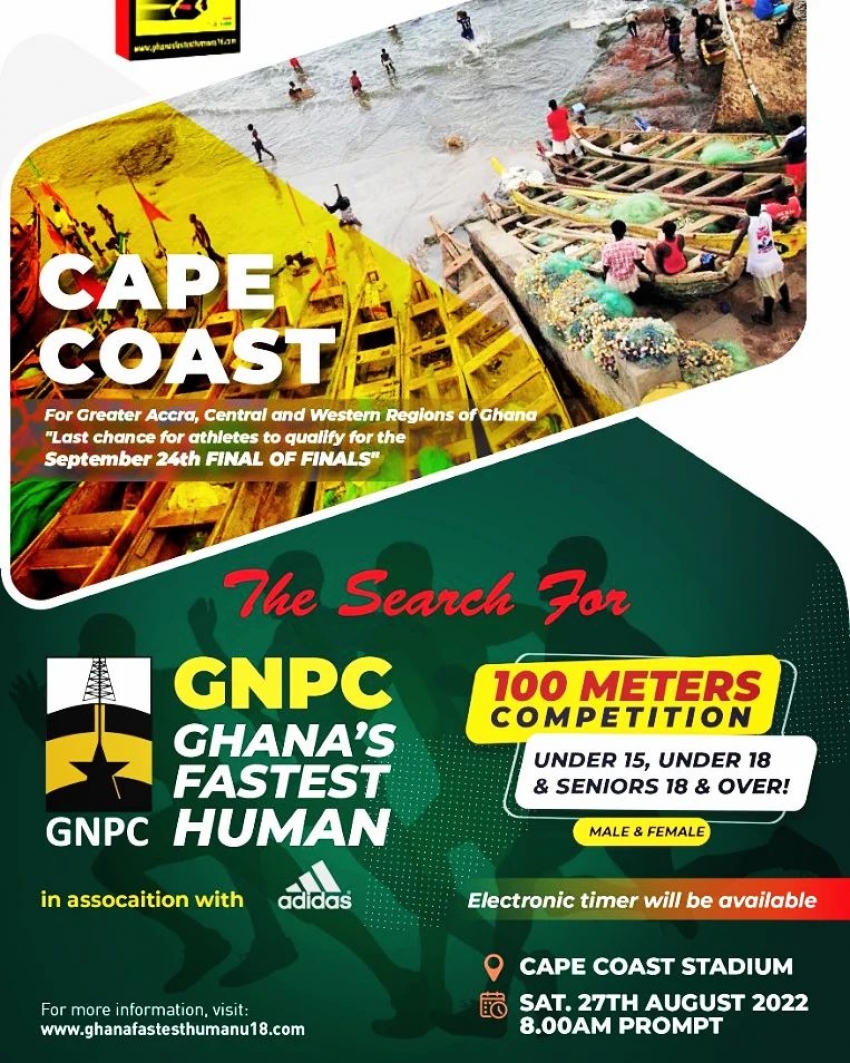 The GNPC Ghana Fastest Human Event – 2022 Cape Coast Meet will take place at the Cape Coast Sports Stadium in Central Region on Saturday, 27th August 202 at 8:00 am for registration and schedule at the same venue.