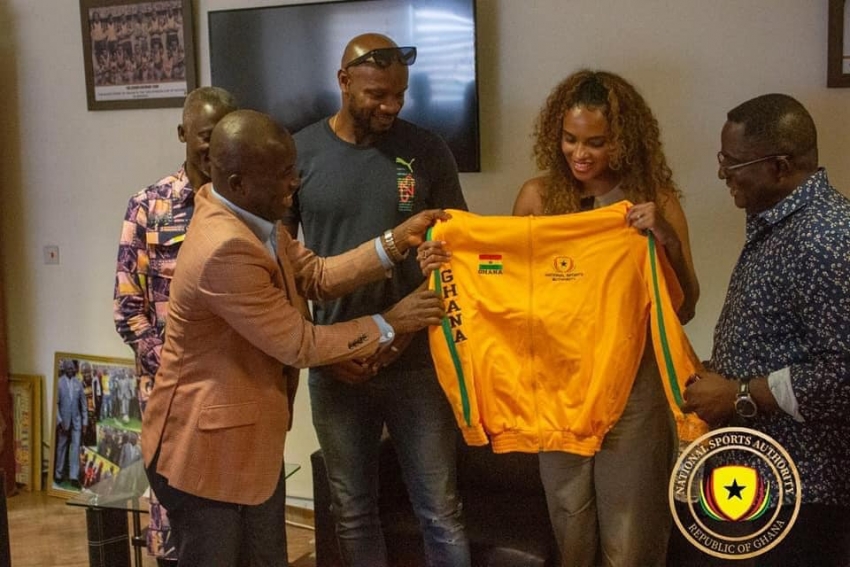 Jamaican top Sprinter, Asafa Powell and wife Alyshia led by the President of Ghana Olympic Committee, Mr Ben Nunoo Mensah on Thursday paid an amazing courtesy call on the Director General of National Sports Authority, Prof. Peter O. Twumasi .