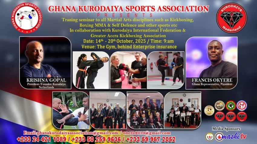 The Greater Accra Kickboxing Association in collaboration with Kurodaiya Sports Association will organize a training programme for martial artists and coaches from 14th to 20th October 2025 at The Gym, behind Enterprise Insurance head office in Accra at 9:00 a.m.